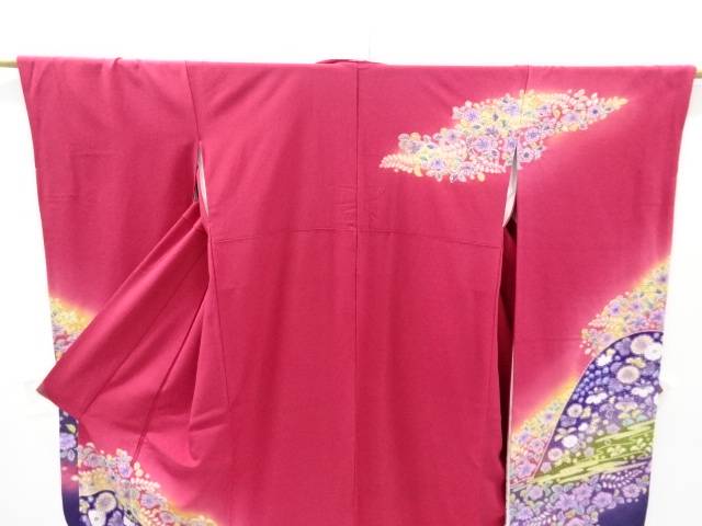 <着物サイズ>(単位:cm) 身丈165身丈(出し)15 裄67裄(出し)1 袖丈109袖丈(出し) 後幅30.5前幅24.5 つま下80.5 時代 現代(1989 - ) 状態 非常によい 素材 正絹 色目 赤紫 【商品説明】(着物)衿は広衿です。