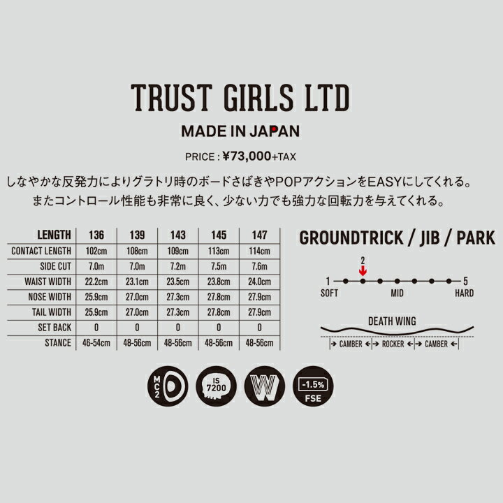 ブランド:DEATH LABEL モデル:TRUST GIRLS LTD WHITE 形状:DEATH WING シェイプ:TWIN フレックスレベル:2 適正スタイル:GROUNDTRICK .PARK .JIB ※上記詳細はメーカーカタログに基づいて掲載しています。